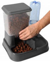 Un distributeur de nourriture manuel est fabriqué le plus souvent en plastique, et s’avère aussi économique que simple d’utilisation. Il délivre uniquement de la nourriture sèche, qui s’écoule progressivement vers la gamelle au fur et à mesure que l’animal vide cette dernière.