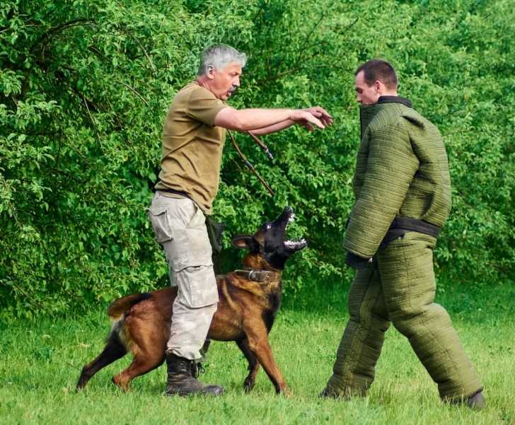 Avant l’attaque, le chien doit être calme et prompt à obéir aux ordres du maître. Lorsque ce dernier tire sur son collier en criant « Attention au chien ! », ce dernier est déjà prêt à l’attaque : il n’attend plus qu’une chose, que son maître lui ôte le collier.