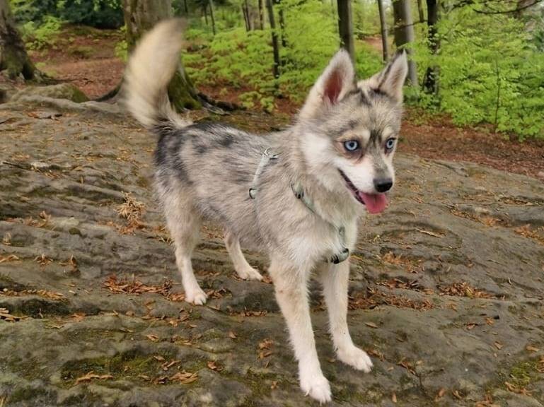 Notre jolie femelle Pomsky, en véritable format "poche" (environ 5 kg), recherche son nouveau foyer pour la vie. C'est une petite femelle Pomsky F1 aux yeux bleus et pleine de vie.
