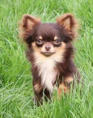 Keith est disponible pour saillie. C’est un magnifique mâle Chihuahua à poil long couleur chocolat prononcé, bien pigmenté et typé. Il est compact et indemne de défaut :