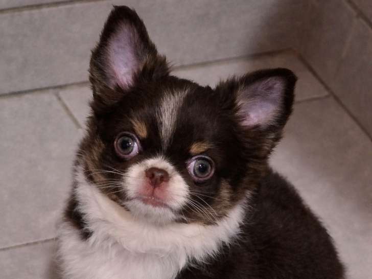 Suite a un désistement avec acompte magnifique petit chihuahua poils longs disponible de suite. Gimmy est un mâle choco tricolore.