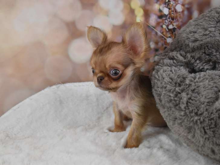 chiot mâle Chihuahua de couleur crème poils longs Petit gabarit entre 1kg600 et 2kg adulte Il a un très beau type, une tête en forme de pomme et un petit museau. Il est sociable. Il est élevé en...
