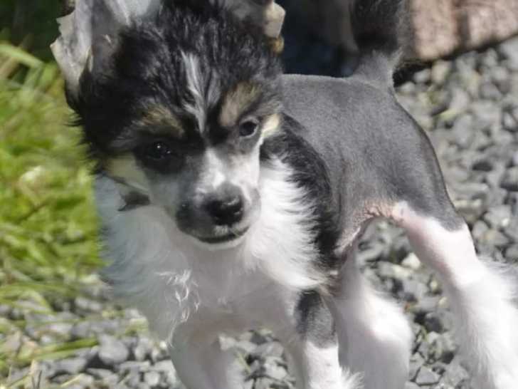 Petit mâle Chien Chinois à Crête nu, hairy noir avec une crinière tricolore. Agé de 8 semaines, très sociable. Il vit avec d'autres chiens depuis sa naissance.
