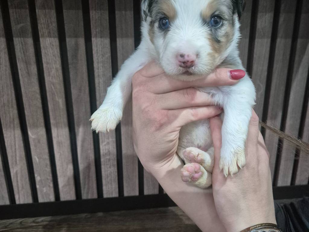 Il y a 3 mâles et 2 femelles dans la portée. Il y a des chiots bleu merle tricolore et d'autres noir et blanc tricolore.