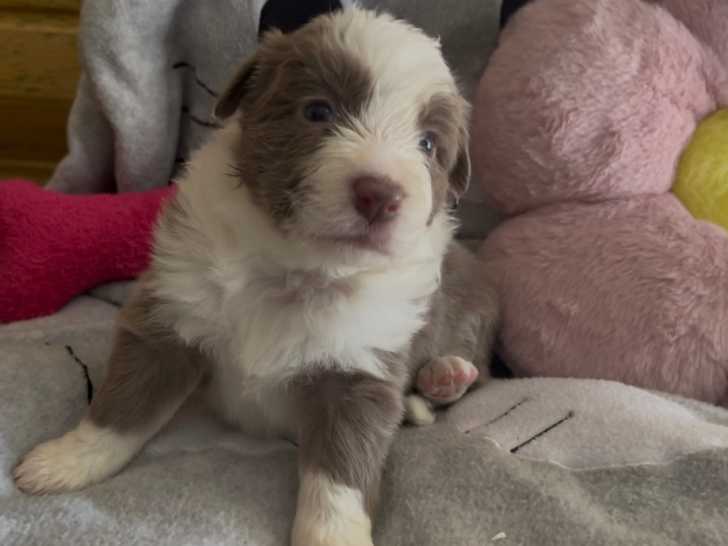 7 chiots Border Collie nés le 17/07/2025 sont à vendre. Il y a 2 mâles (1 noir et blanc et 1 bleu et blanc) et 5 femelles (3 lilac et blanc et 2 bleu et blanc). Ils seront disponibles le 17/09/2025.