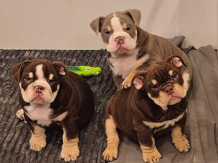 Des chiots Bouledogue Anglais sont disponibles à la réservation. La maman est Panama Moka, femelle tan tricolore, et le papa est Bouba, mâle black and tan porteur de bleu. Les chiots sont nés le 12...