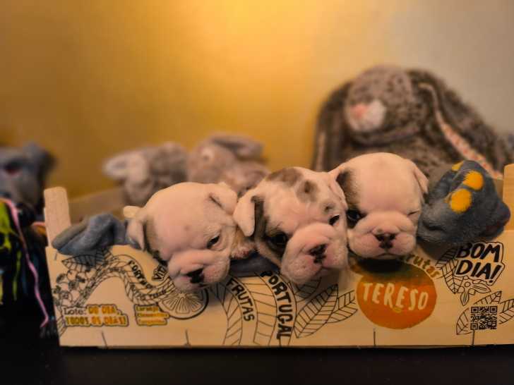 Des chiots Bouledogue Anglais sont disponibles à la réservation. La maman est Panama Moka, femelle tan tricolore, et le papa est Bouba, mâle black and tan porteur de bleu. Les chiots sont nés le 12...
