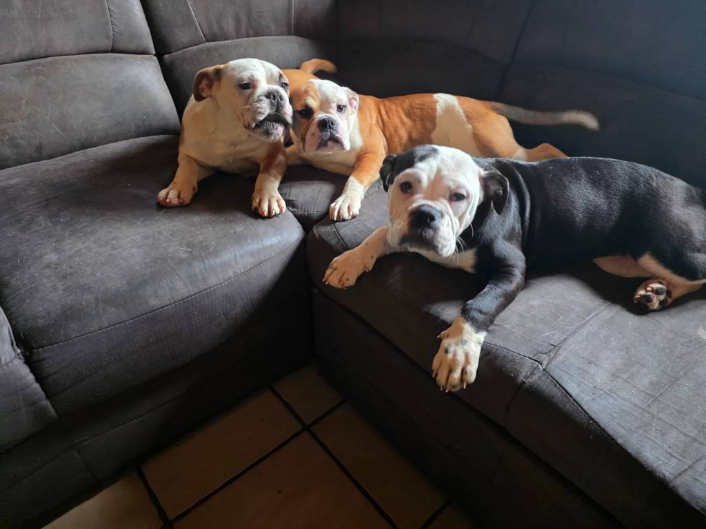 6 jolis chiots Continental Bulldog sont nés le 6 août. Ils sont élevés en famille. La mère et le père sont à la maison. Ce sont des chiens très gentils. Cette race a été créée pour que ce brachycéphale puisse respirer mieux.