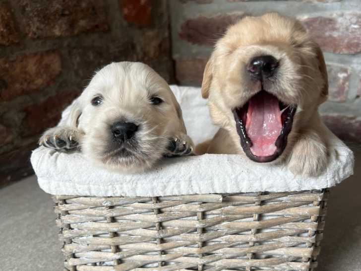 Des chiots Golden Retriever nés le 22 mai 2025 sont à vendre. Il y a 3 mâles et 2 femelles.