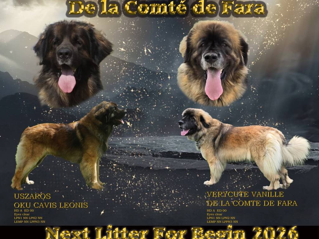 La naissance des chiots est prévue environ le 20/02/2026. Nous sommes un élevage belge officiel de Léonbergs : La Comté de Fara. Nous sommes membres du club belge du Leonberg.
