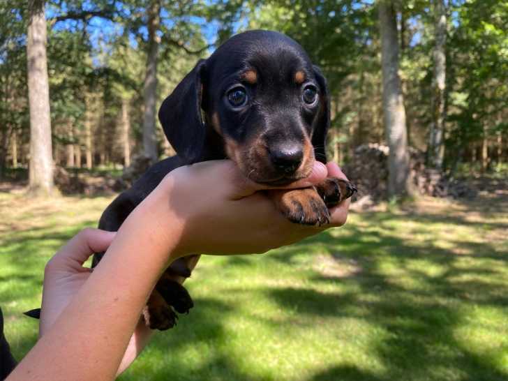 2 magnifiques chiots Teckel Nain à poils ras, de coloris noirs et feu, mâle et femelle, nés le 18 juillet 2024, sont à réserver pour une adoption à partir du 19 septembre 2024.