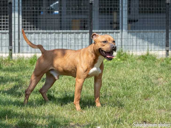 Coucou, humain, je m’appelle Tyson et j’ai pointé le bout de ma truffe le 25 mai 2017. Je suis un impressionnant loulou type American Staffordshire Terrier. Ma robe fauve panaché blanc et mon allure d’athlète provoquent l’admiration de mon entourage.