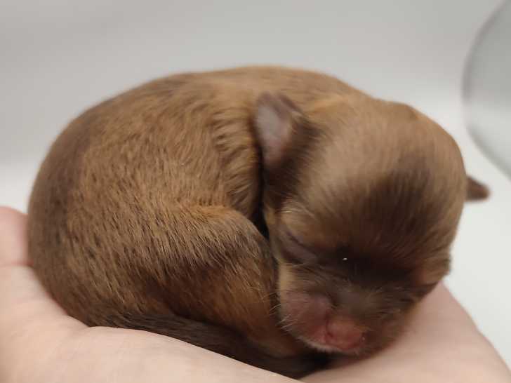 C'est un petit gabarit, la plus petite de la portée. Poils long chocolat claire