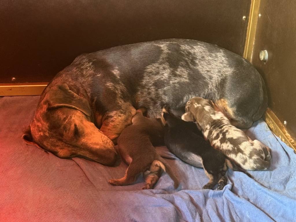 Portée de Teckels Nains né le 14/04/2026. La mère est blue merle et le père est chocolat tan.