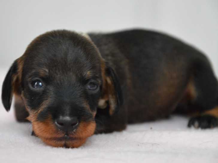 L’élevage Des Nuits Des Feux a le plaisir de vous annoncer la naissance le 23 mars 2022 d’une magnifique portée de Teckels poil dur Kaninchen pedigree FCI. Une femelle et trois mâles à la sublime robe noire et feu restent encore disponibles à ce jour. Ces bouts de chou pourront déserter le cocon familial dès fin mai 2022. Ils partiront au prix de 1800 euros chacun.