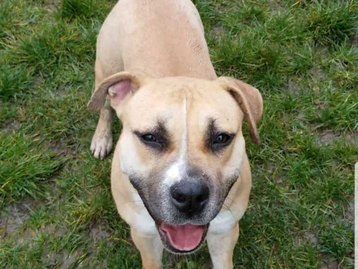 Famille au grand cœur, je m’appelle Smile. J’ai pointé le bout de ma truffe le 19 octobre 2020. Je suis une splendide femelle American Staffordshire Terrier non LOSH. Ma robe sable panaché blanc et mon physique de rêve attirent tous les regards.
