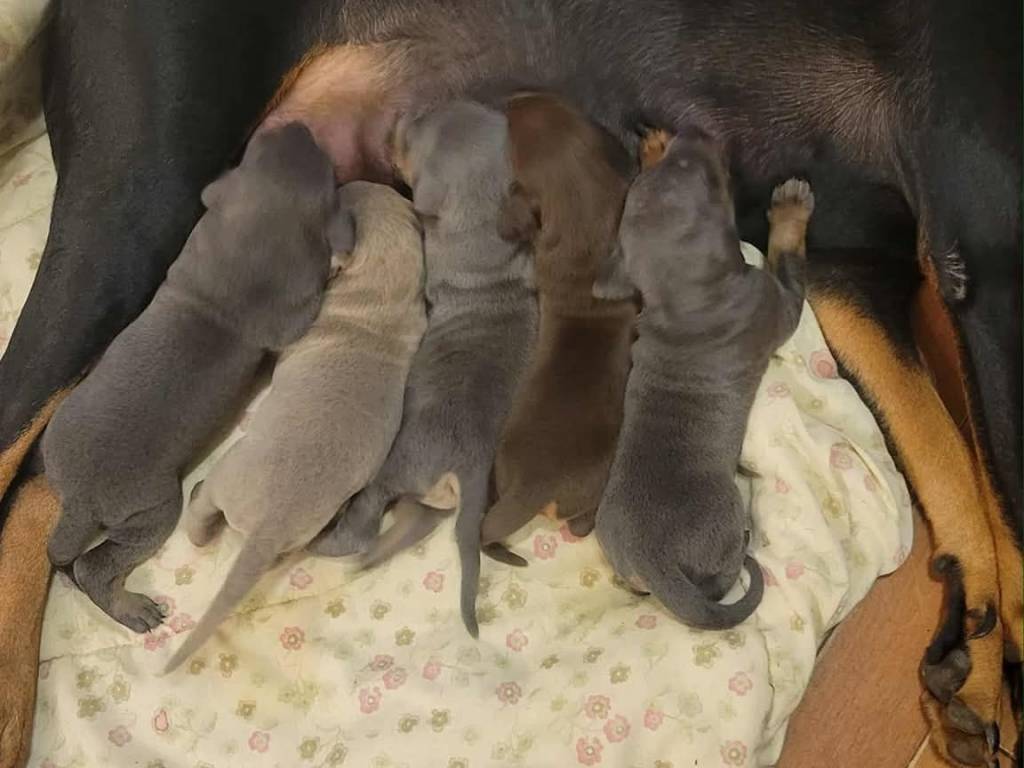 Notre belle petite femelle Doberman a eu une portée. Le papa est un gros mâle Doberman de couleur bleu. L'union a donné de beaux petits bébés en santé, de couleurs différentes : brun, bleu et isabella.