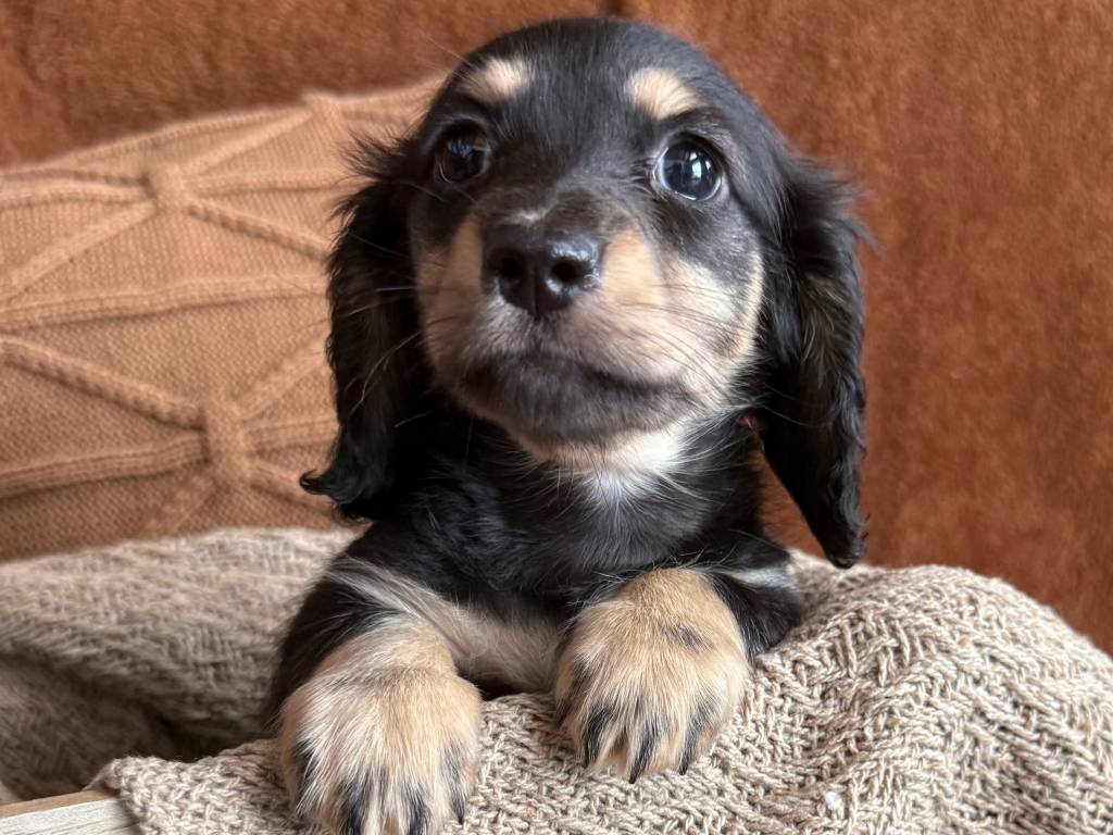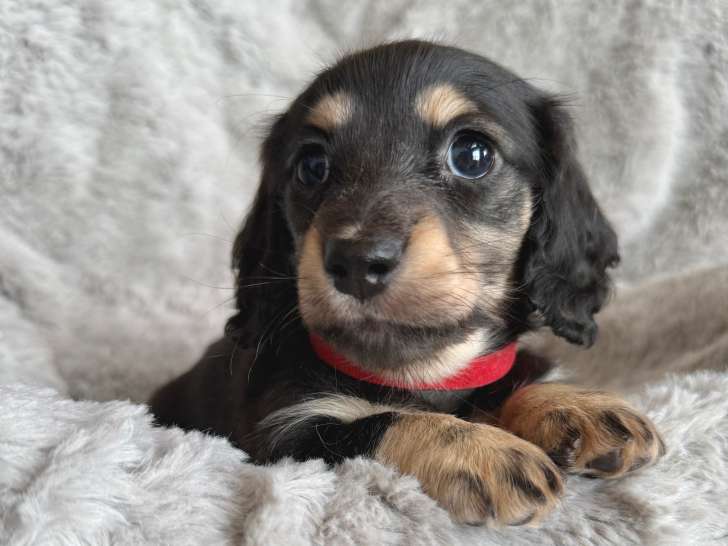 1 chiot Teckel miniature à poil long, de couleur noir et crème, né le 24 février 2026, est à vendre.