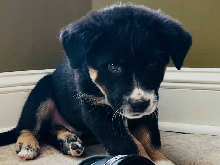 Le papa est un Berger Australien bleu merle aux yeux bleus issu d’une lignée d’élevage certifiée, et la maman est un Berger Allemand tricolore.