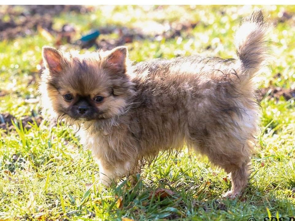 Notre petit Chihuahua à poil long, né le 19 octobre 2025, est issu d'une lignée sélectionnée de notre élevage professionnel "De la Cité des Conquistadores". Ce mâle bringé est un nounours très fourni en poil, extrêmement câlin et amateur de bisous.