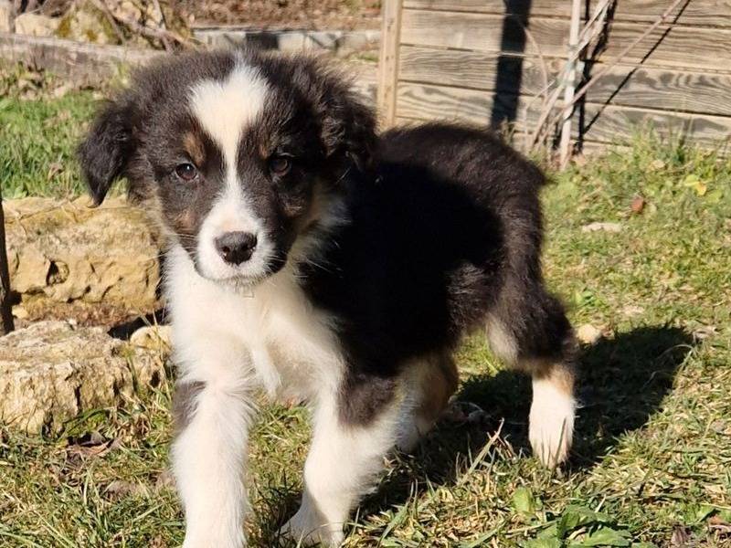Sur une portée de neuf chiots Berger Australien nés le 19 octobre 2025, il reste un mâle à vendre. Ce petit noir tricolore à queue longue est disponible immédiatement pour 900 euros.