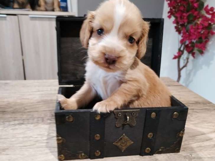 Nous proposons un chiot Cocker Anglais non inscrit au Livre des Origines Français (non LOF) né le 12 janvier 2026, disponibles à partir de mi-mars. Il reste actuellement le seul restant disponible sur une portée de cinq, les autres ont trouvé preneurs.