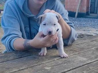 Nous proposons une femelle American Staffordshire Terrier née le 28 septembre 2025, inscrite au Livre des Origines Français (LOF). Elle est pucée, vaccinée, vermifugée et accompagnée d’un certificat vétérinaire et d’un passeport européen.