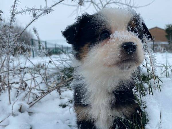 Notre femelle Berger Américain Miniature est née le 24 novembre 2025 et pèse le poids typique de la race. Elle est socialisée avec enfants et autres animaux, et s’adapte parfaitement à la vie en famille.