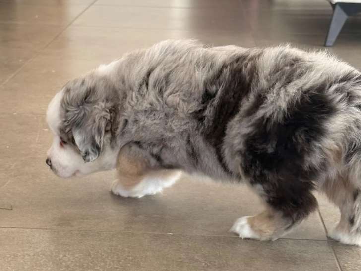 Parmi les jeunes chiots élevés dans notre structure Du Sentier D’Opale, un unique mâle attire naturellement l’attention au sein de sa portée. CHIOT 5, mâle Berger Américain Miniature bleu merle à queue longue, est né le 14 janvier 2026 dans notre élevage situé à St Mards De Blacarville. Il grandit entouré de quatre sœurs dans une portée de cinq chiots inscrite au Livre des Origines Français (LOF), registre qui garantit la traçabilité officielle des lignées.
