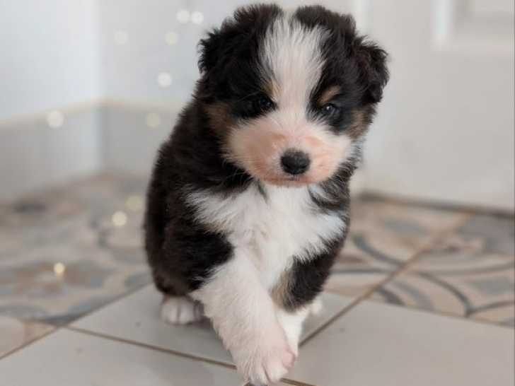 Nous vous proposons un chiot Berger Australien issu de parents LOF testés ADN et indemnes de dysplasie. Ce petit mâle noir tricolore est élevé au cœur de notre famille pour un développement optimal.