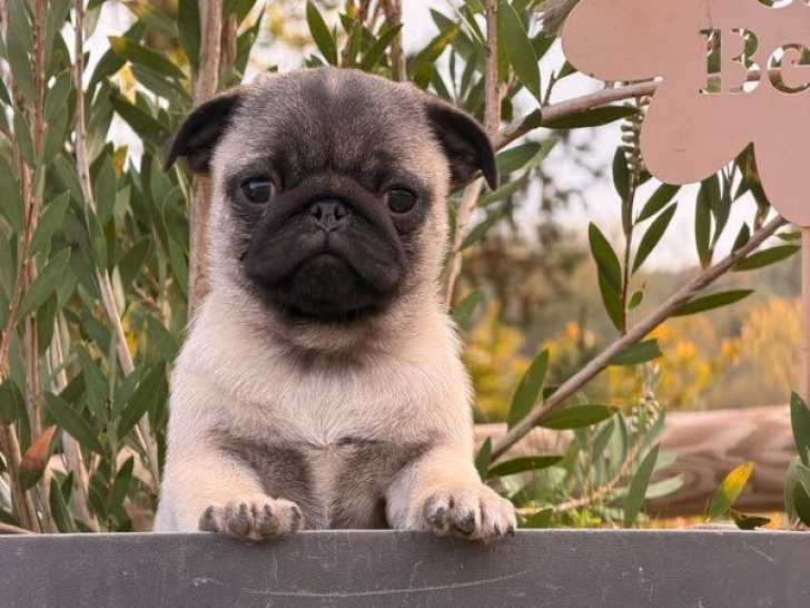 L'élevage Du Clos de Compostelle propose Arthur, chiot Carlin né le 3 août 2025, élevé en famille et habitué aux enfants et autres animaux. Il est pucé, vacciné et accompagné d'un certificat vétérinaire.