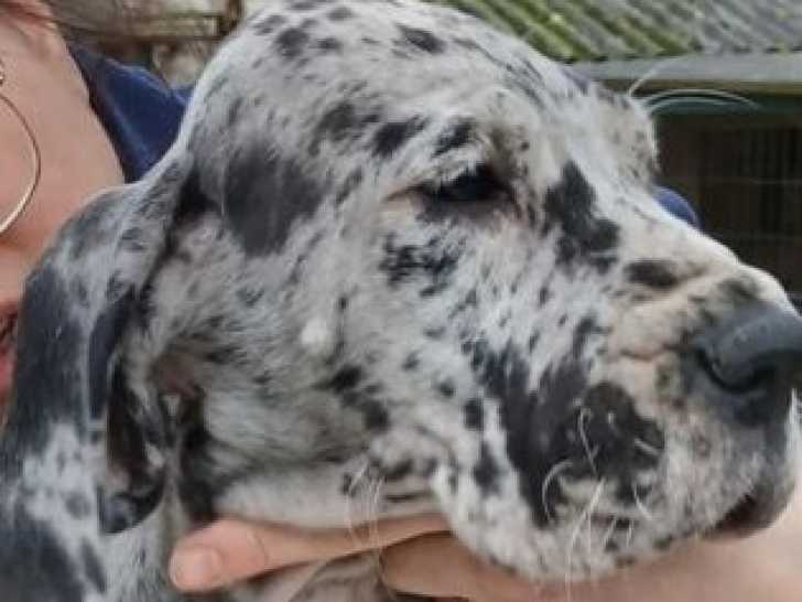 Azzaro est un splendide Dogue Allemand né le 18 octobre 2025. Ce petit au pelage moucheté et au caractère équilibré est proposé au prix de 2200 euros.
