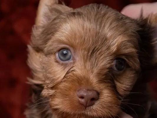 Sur une portée de trois chiots Yorkshire Terrier nés le 6 octobre 2025, il reste un petit à réserver. Un mâle merle chocolat aux yeux verts cherche une famille pour 2000 euros.