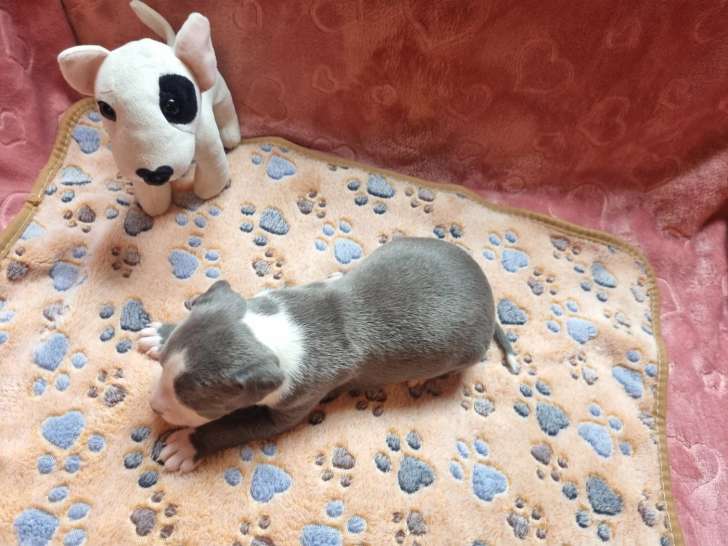 Âgée de plus d’un mois, cette femelle American Staffordshire Terrier est née le 16 Janvier 2026. Elle se distingue par sa robe bleu pan blanc, aux contrastes nets et harmonieux. Son inscription au Livre des...