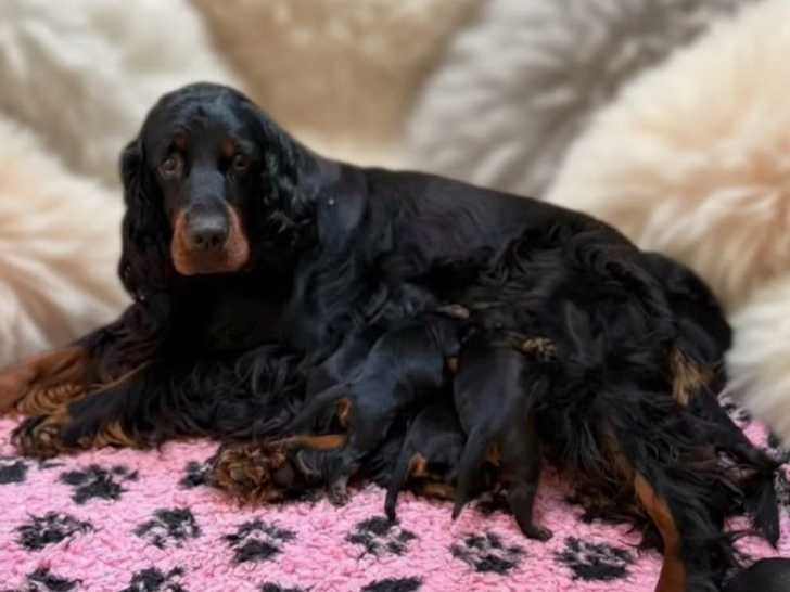 Cinq femelles et six mâles Setter Gordons nés le 28 décembre 2025 sont à réserver. Ces petits grandissent en famille et sont parfaitement habitués aux bruits du quotidien pour une sociabilisation optimale.