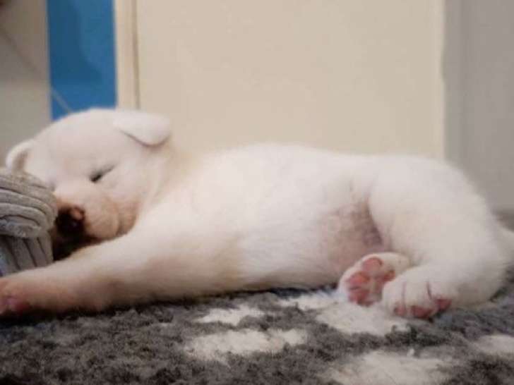 Nous demandons 1800 euros pour chaque chiot. Il reste disponible à la réservation une femelle bringée et un mâle blanc.
