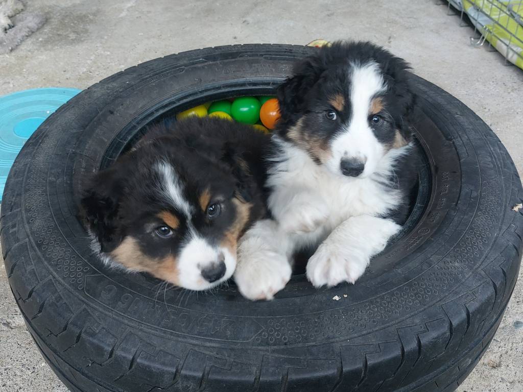 2 chiots Berger Australien queue longue à vendre. 1 mâle noir tricolore au prix de 1100 euros et 1 mâle noir tricolore au prix de 900€ (prognathisme supérieur, ne pourra probablement pas être confirmé) .