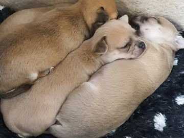 Ces petits sont issus du mariage d’une chienne bleue et tan pesant 2,4 kg, et d’un chien fauve avec un poids plume de 1,9 kg.
