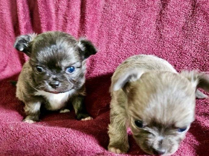 Pour 1600 euros la femelle et 1500 euros le mâle, réservez l'un de nos magnifiques chiots Chihuahua poils longs nés le 3 janvier 2026. Ils arborent des robes rares, bringée et lavande, et atteindront un poids adapté à la race une fois adultes.