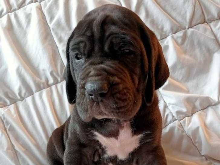 Un chiot mâle Dogue Allemand, né le 07 avril 2025 et issu de très belles origines, est disponible à l’élevage des Gardiens De Prailles. Ce magnifique mâle noir à manteau se distingue par une ossature solide...