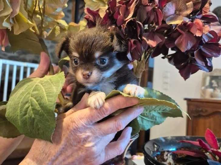 Sur une portée de chiots Chihuahuas nés le 12 septembre 2025, deux femelles à poil long sont à réserver. L'une est chocolat, l'autre chocolat avec un trait blanc sur la tête.