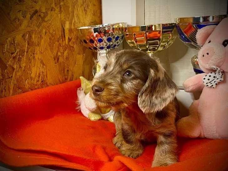 Le Domaine de la Veyssière vous propose à la réservation plusieurs superbes chiots Teckel à poil dur, nés le 15 mars 2025. Sur une portée de cinq, il reste un mâle chocolat qui sera cédé au prix de 1800 euros ainsi qu’un autre arlequin chocolat aux yeux vairons à 2490 euros. Ces animaux, élevés avec passion depuis plus de vingt ans, sont issus de parents confirmés et testés génétiquement.