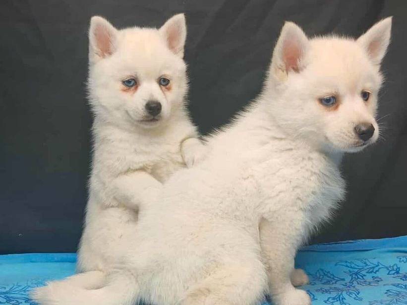 Pour 1200 à 1300 euros, adoptez l'un de nos deux magnifiques Pomsky F3 nés le 5 septembre 2025. Ils arborent une robe blanche avec des yeux bleus, et pèseront environ 6-7 kg une fois adultes.