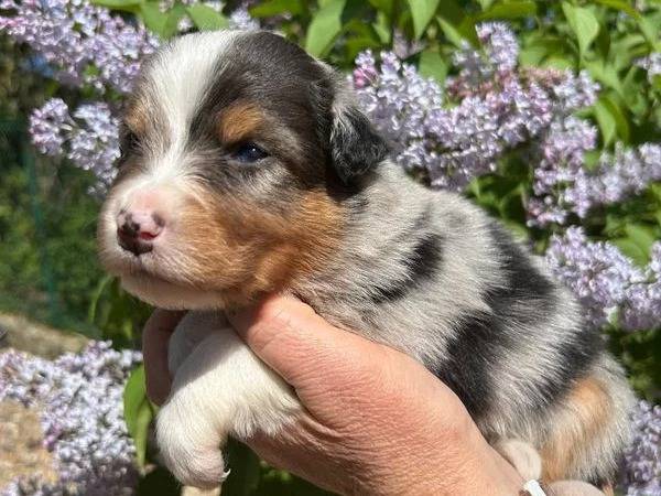 Ary du Royaume des Khaleesis, un mâle Berger Australien noir tricolore queue longue, né le 31 juillet 2025, recherche sa famille pour la vie. Il mesure 50 cm pour 20 kg, est castré et entièrement vacciné, issu...
