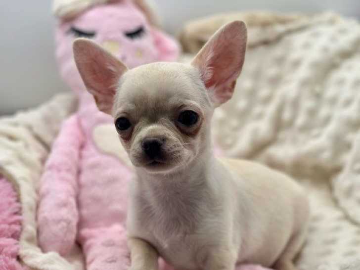 L’élevage Des Petits Stanislas vous propose trois adorables chiots Chihuahua nés le 8 avril 2025, parfaitement socialisés. Il s’agit de deux mâles poil court (fauve et blanc) et d’une femelle poil court blanche/crème.