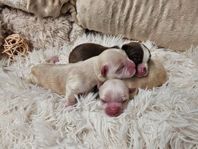 Trois chiots Chihuahuas à poils longs sont disponibles à la réservation. Nés le 2 octobre 2025, ces petits trésors crème et chocolat seront prêts à partir à 9 semaines.
