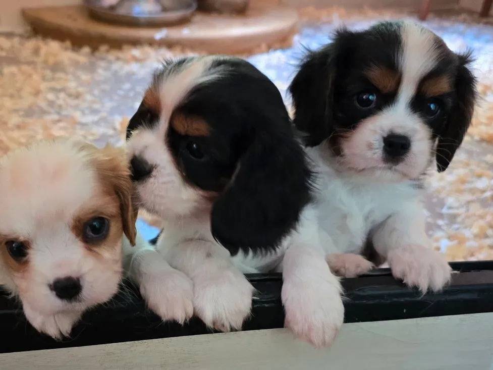 Nous proposons trois merveilleux chiots mâles Cavalier King Charles, nés le 18 août 2025. Deux tricolores et un blenheim attendent leur future famille.