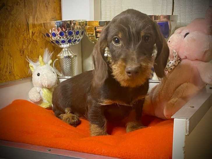 Le Domaine de la Veyssière vous propose à la réservation plusieurs superbes chiots Teckel à poil dur, nés le 15 mars 2025. Sur une portée de cinq, il reste un mâle chocolat qui sera cédé au prix de 1800 euros...