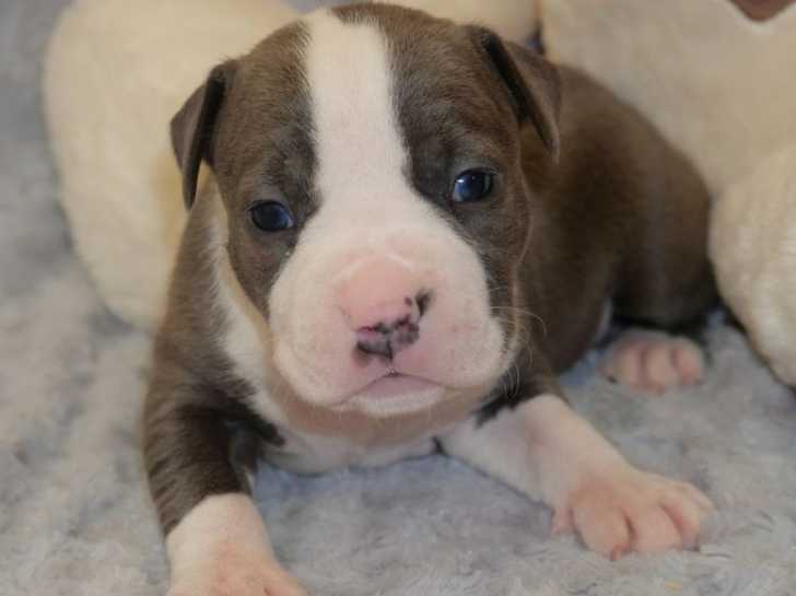 Nous proposons à la réservation nos quatre petits Amstaffs dont trois mâles et une femelle, qui sont nés le 16 février 2022. La femelle a un pelage marron et blanc tandis que chaque mâle est soit bleu soit marron et blanc. Tous les trois figurent au Livre des Origines Français (LOF).