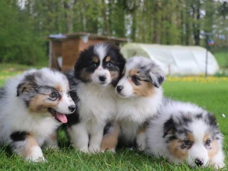 Le Domaine du Hameau du Fayel vous propose à la réservation une portée de 4 chiots Berger Australien âgés de deux mois. Vous avez le choix entre trois femelles et un mâle. Alyana et Amaris, deux magnifiques femelles bleu merle, sont proposées au prix de 1 600 euros. Alesia, femelle noir tricolore, est disponible pour 1 300 euros, tandis qu’Axion, mâle bleu merle, coûte 1 600 euros.